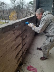 Ремонт кирпичной кладки на переходных балконах в доме №2 ул. Михаила Марченко.